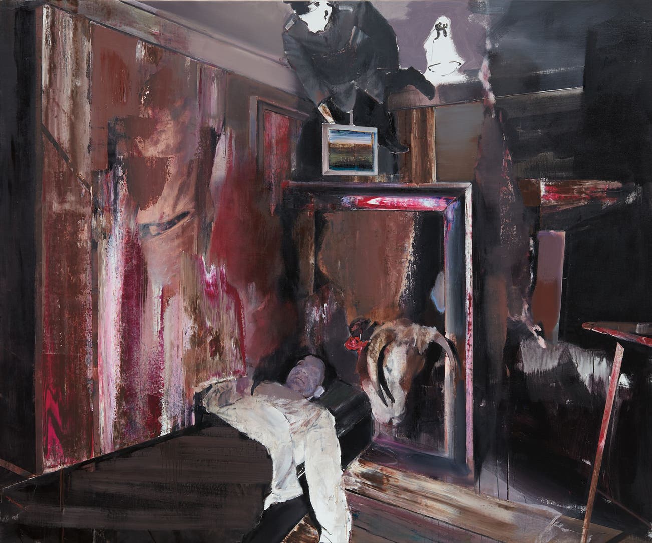 Drawing on Charlie Chaplin’s The Great Dictator as a visual source, Ghenie’s sombre figures are often made to look obtuse, humiliated and comic, bordering on the slapstick, as demonstrated in the artist’s Pie Fight series. This series reduces and renders the iconography of political regimes and dictators as ridiculous while also acting as a metaphor for the banality of evil. Drawing upon the Jungian idea of collective unconscious, Ghenie’s interest in twentieth century cinema and visual culture has informed his constructed worlds; uncanny objects, recognisable places and familiar yet frightening scenes create atmospheric and cinematic interiors, where we are unable to separate what we know with what we have seen. Similarly, after seeing David Lynch’s series, Twin Peaks, Ghenie’s paintings can be viewed as having a Lynchian quality; the surroundings are everyday, yet become submerged in a world of surreal conversations, Kafkaesque pursuits and extraordinary circumstances. Remarking on the series Ghenie states ‘I think consciously and unconsciously I want to master in painting what Lynch has done in cinema. It was with Lynch that I started to build the visual language of my paintings’ (Adrian Ghenie, quoted in Stephen Riolo, ‘Adrian Ghenie, Pie Eater’, Art in America, 26 October 2010).