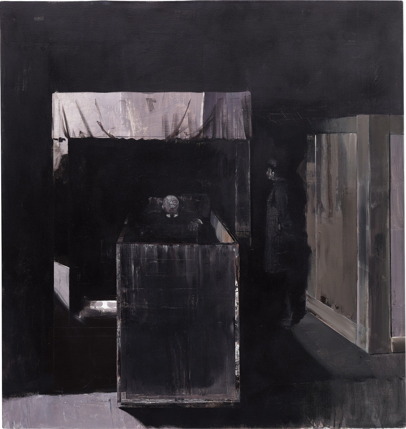 Thematically surreal and stylistically visceral, Adrian Ghenie’s Found is a powerful work that exemplifies the artist’s unique painterly idiom and the astute lens through which he probes the uncomfortable ambiguities of human history. The viewer is presented with a foreboding and uncanny mise-en-scène steeped in darkness – theatrically lit to reveal a disorienting space in which architectural forms shift in and out of each other. Enclosed by a structure evocative of a casket, a haunting figure emerges from the shadows of a four-post bed, its face rising out of the shadows as a ghostly white blur. Executed in 2007, Found belongs to a cycle of fifteen works from Ghenie’s Shadow of a Daydream series, exhibited at his breakthrough show at Haunch of Venison in Zurich, 2007. Delving into the mantles of history, this series set the foundation for Ghenie’s famed Pie Fight series, 2008-2009, and already laid out many of the themes that Ghenie would continue to explore in his celebrated contribution to the Romanian Pavilion at the 56th Venice Biennale in 2015.