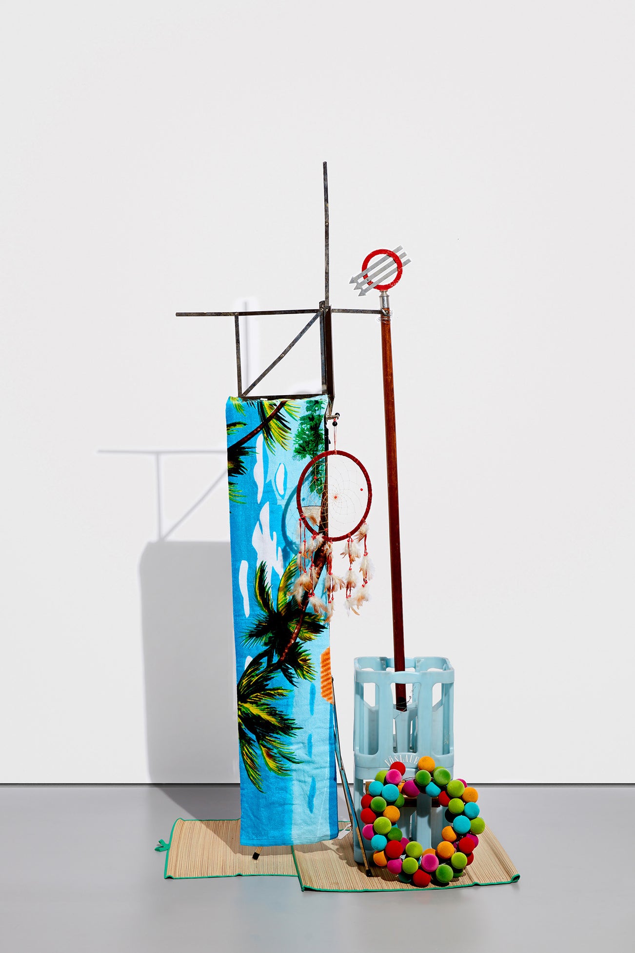 printed fabric, dreamcatcher, plastic water crates, natural fiber mat, fabric-coated balls and metal frame
