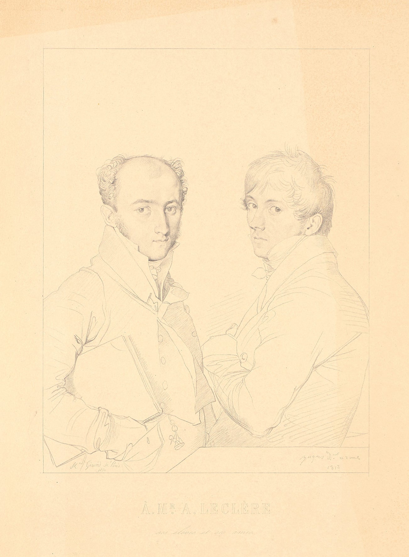 Portrait of French architects Achille Leclère (left) and Jean Louis Provost (right) while studying in Rome, after a 1812 drawing by Ingres now at the Smith College Museum of Art. Louise Girard was a female painter and engraver; wife of Alexis François Girard, worked in collaboration with him, sometimes lettered as Mme Girard. This image was exhibited at the Paris Salon in 1850.