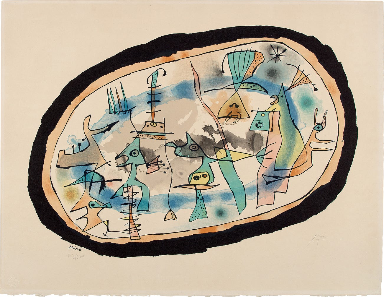 Signed and numbered 153/300 in pencil, published by Maeght, Paris (with their blindstamp), with the colors slightly attentuated, a pinpoint foxmark at the upper center margin, mat-staining, a soft crease at the upper left and right sheet corners, otherwise in good condition, framed.