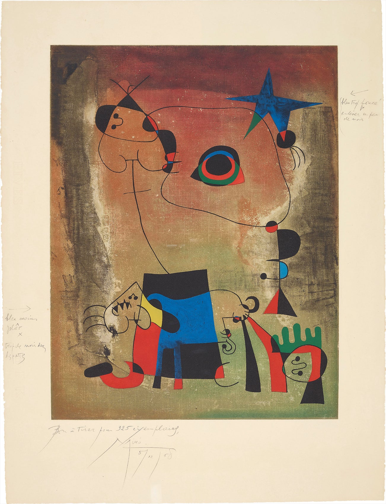 Signed, dated '5/12/58', annotated 'Bon à tirer pour 325 exemplaires' and printing annotations by Miró in pencil (the good-to-print proof impression, before the edition of 300 and 25 artist's proofs), printed by Atelier Crommelynck and published by Maeght, Paris, unframed.