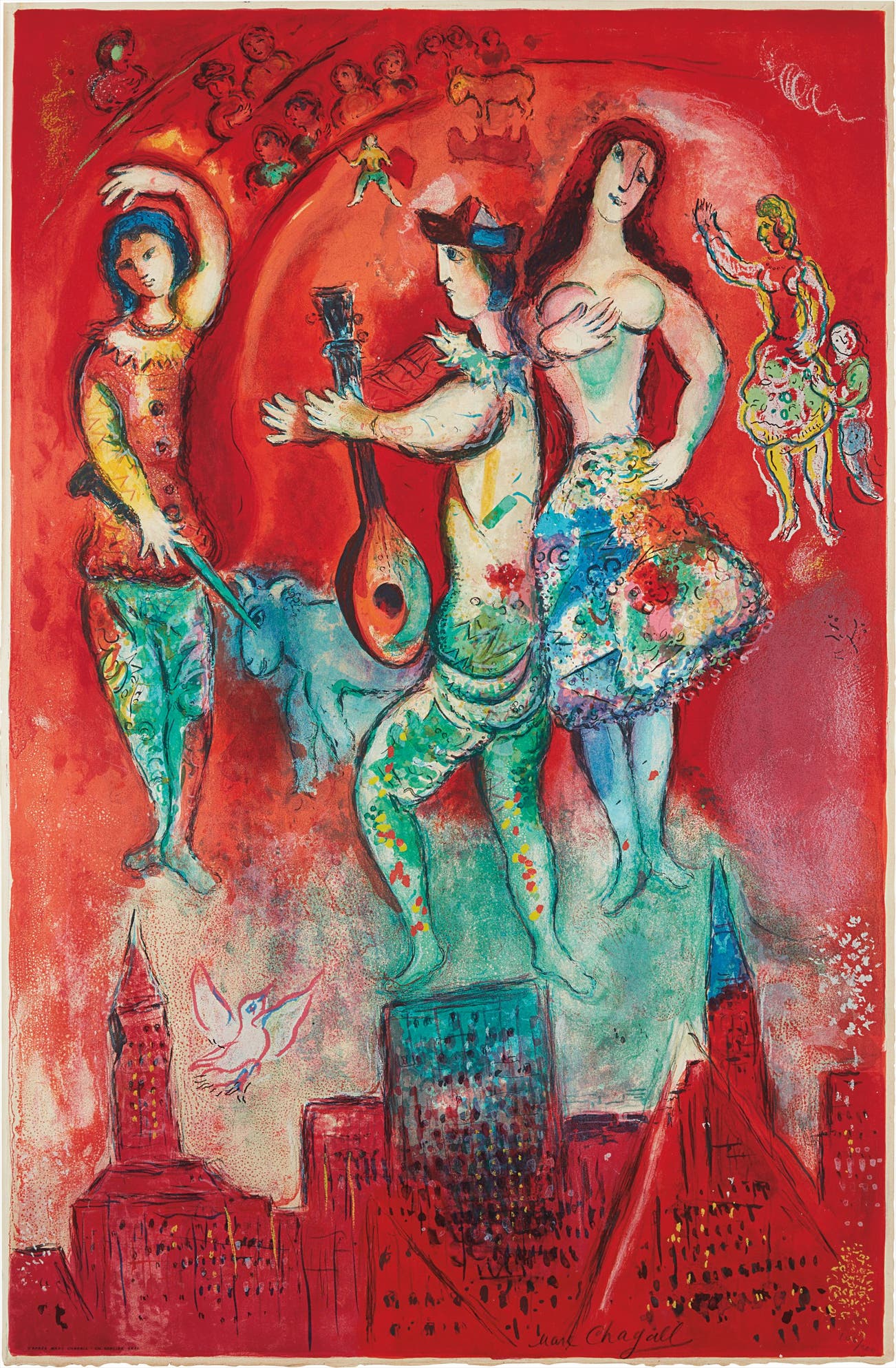 This large and layered lithograph was created from a detail taken from the upper left corner The Triumph of Music, the monumental mural Chagall had painted for the south wall of the Metropolitan Opera House in Lincoln Center Plaza in 1966. The male figure in the middle is Rudolf Bing, the director of the New York Opera and sponsor of the printing.