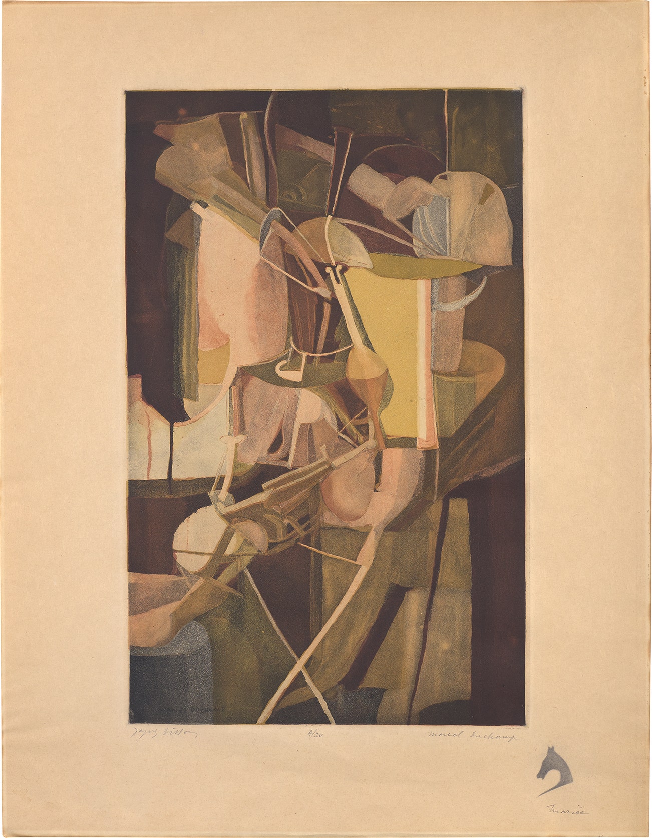 Signed by Duchamp and Villon, titled and numbered 4/20 in pencil, with the profile of a Chess Knight stenciled in graphite (from the special edition, the regular edition was 200 without the Chess Knight stencil), published by Galerie Bernheim-Jeune, Paris, framed.