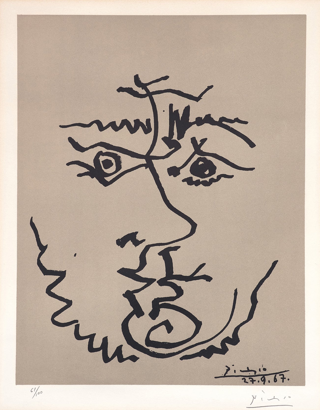 This lithograph was created after a drawing by Picasso published on September 27, 1967, for the cover of the newspaper Le Patriote.