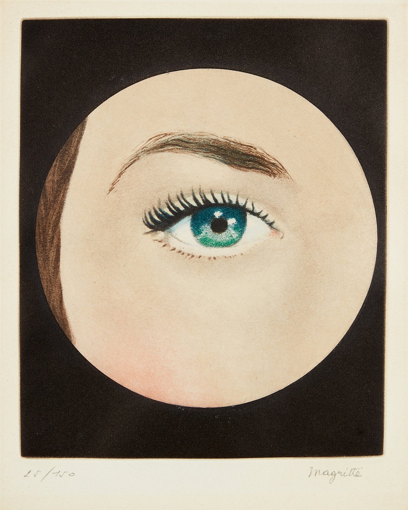 Stamp signed and numbered 25/150 in pencil (there was also an edition of 150 on Japon nacré and 25 hors commerce on Rives and Japon nacré paper), published by Editions Georges Visat, Paris, with the Gravure Originale Atelier René Magritte blindstamp, framed.