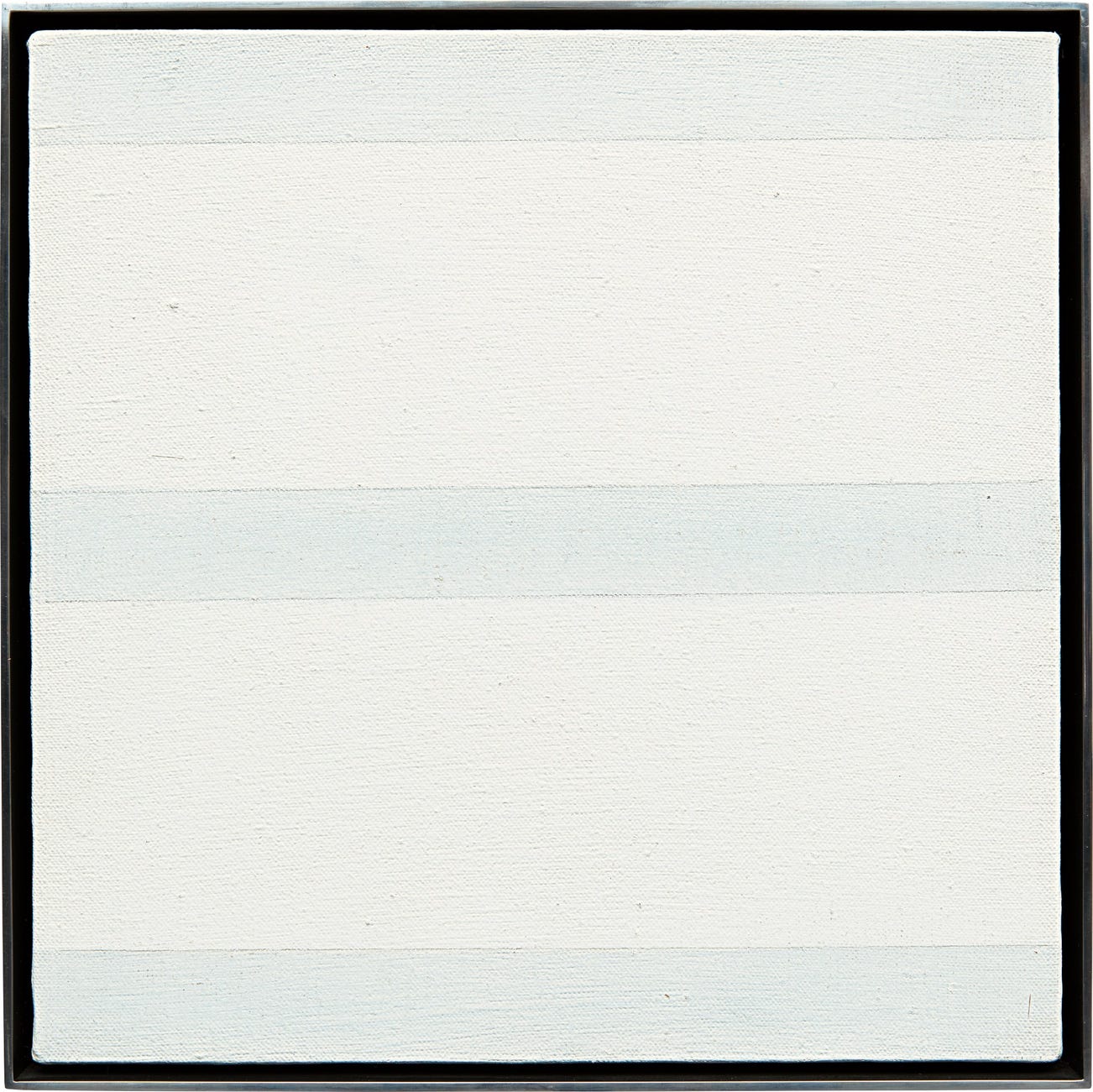 These works present a portal into Martin’s unique spiritual sensibility, and yet are born of a tightly regulated system: emotional verve impeccably and intriguingly obfuscated by an exquisitely structured façade. In the present paintings, the tenets of composition and perspective are stripped down to their essentials, the stunning result being the achievement of unclouded aesthetic serenity. The artist’s gentle manipulation of the logic of geometry and classical perfection contrasts with the solidity of her pictorial structure. By employing Minimalist abstraction not as a clinical device, but rather as a means of revelation, she achieves a perfection of the surface that engenders beauty, calm, and self-reflection in the viewer.
