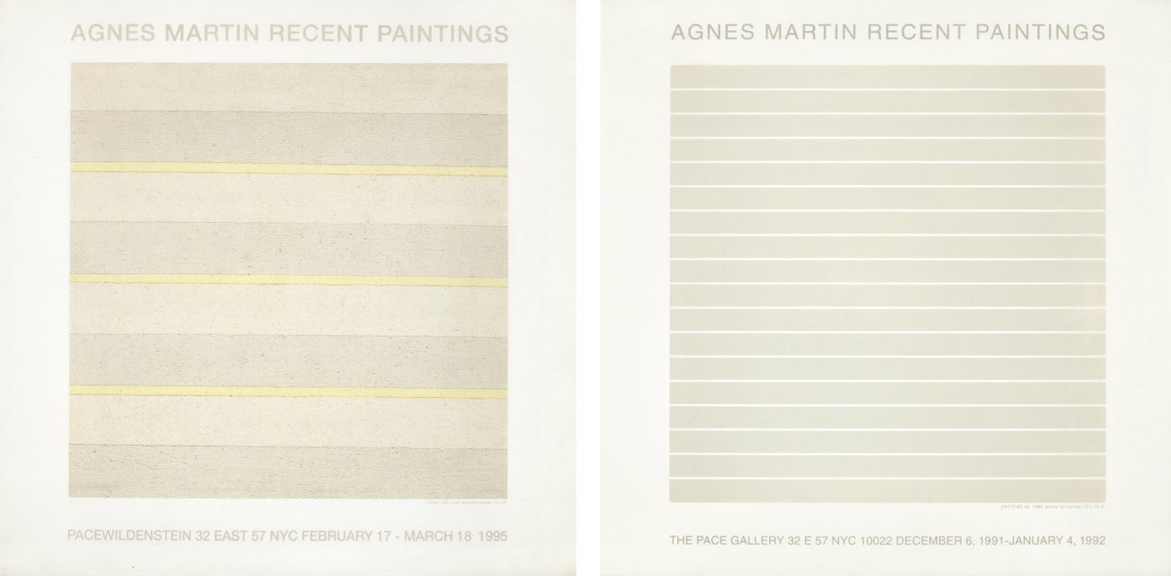 From the edition of unknown size, published by Pace Gallery, New York, as an announcement for their exhibition Agnes Martin Recent Paintings in 1991, both framed.