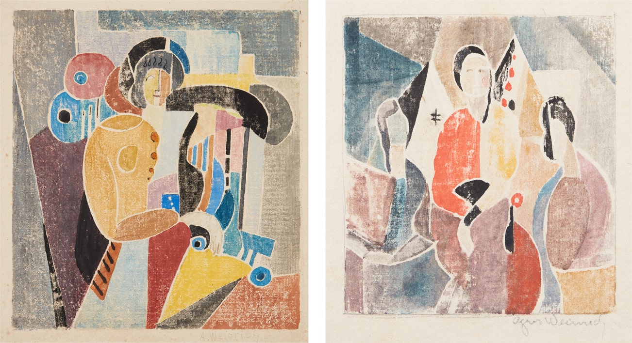 Two white-line woodcuts in colors, on wove paper, with margins.