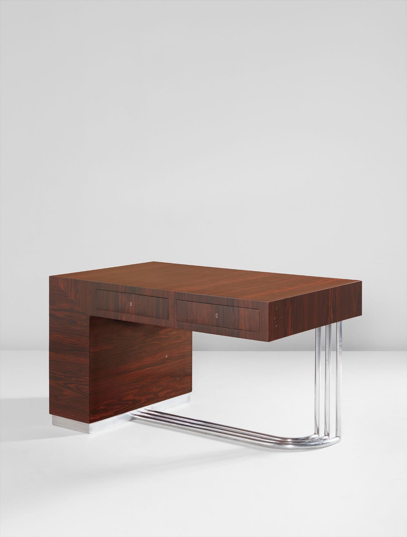 Caucasian walnut-veneered wood, aluminum, chromium-plated steel.