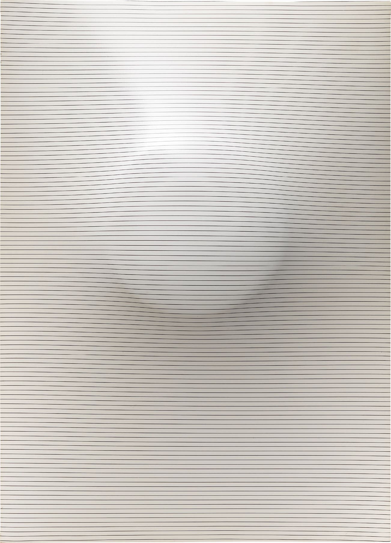 Diffusing a new dynamism into post-war Italian art after abandoning his formal studies of technical and mechanical design, Agostino Bonalumi’s knowledge of construction inspired his artistic output, whereby he examined the differing effects on the eye by manipulating form and colour in conjunction. In the present work, Bonalumi’s use of alternating black and white line emphasises the artist’s preoccupation with the dynamic perception of tone, a central element in his exploration of light and space. Bonalumi surpasses colour in favour of the luminous interplay of dark and light, which changes with the positioning of the viewer and the alteration of the light source. A mysterious presence lurks beneath the surface; a circular bulge distorts the picture plane, invoking the artist’s interest in modulation and optical illusion.