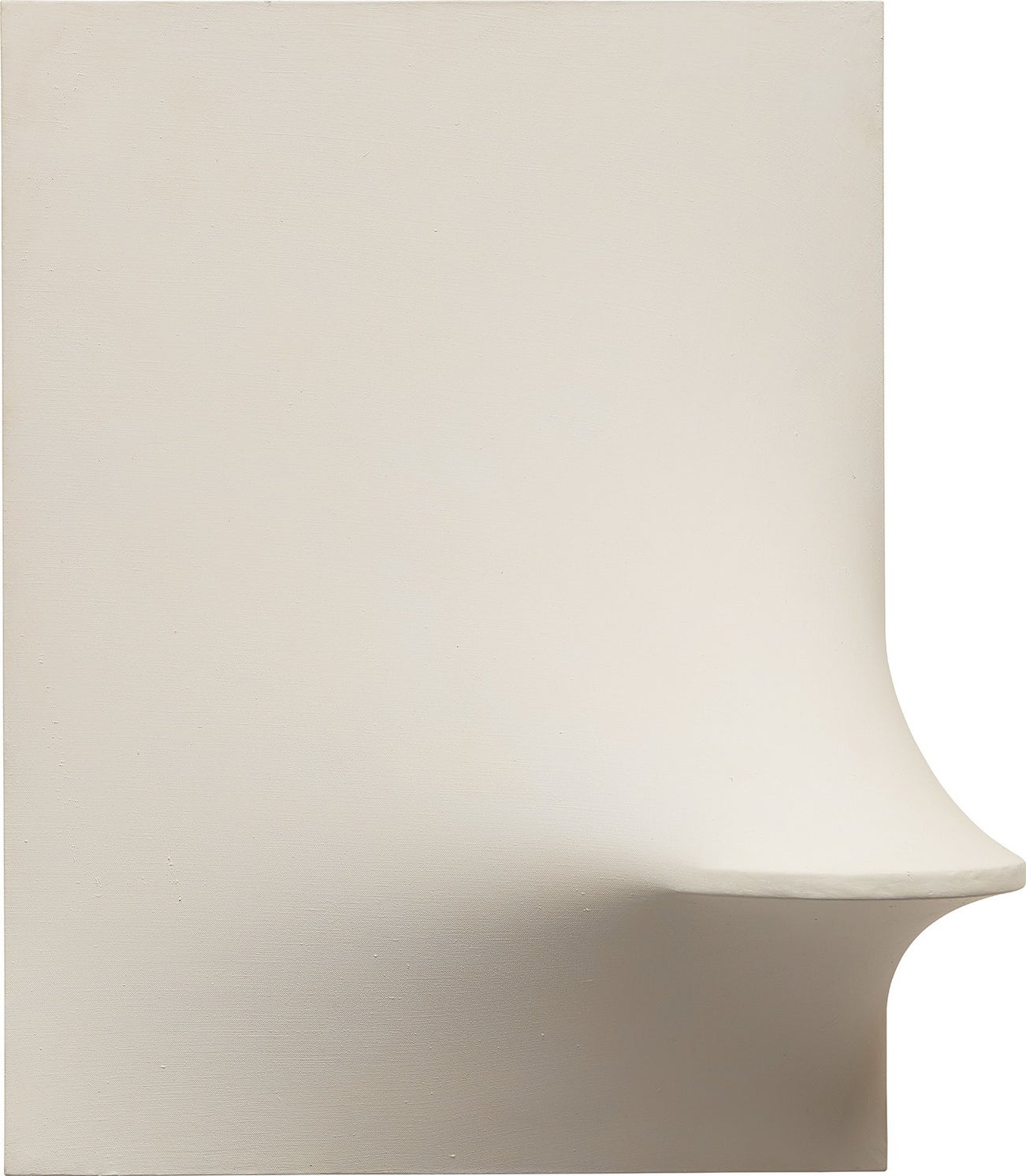 Quiet and discreet until the canvas’s all-consuming white meets a charismatic excrescence at its right margin, Agostino Bonalumi’s Bianco aptly falls within the Italian artist’s long-standing examination of tense space. Executed in 1967, the present work is paradigmatic of the artist’s celebrated Pittura Oggetto, whereby the painting becomes an object thus investgating the presence of both investigating the presence of both matter and void.