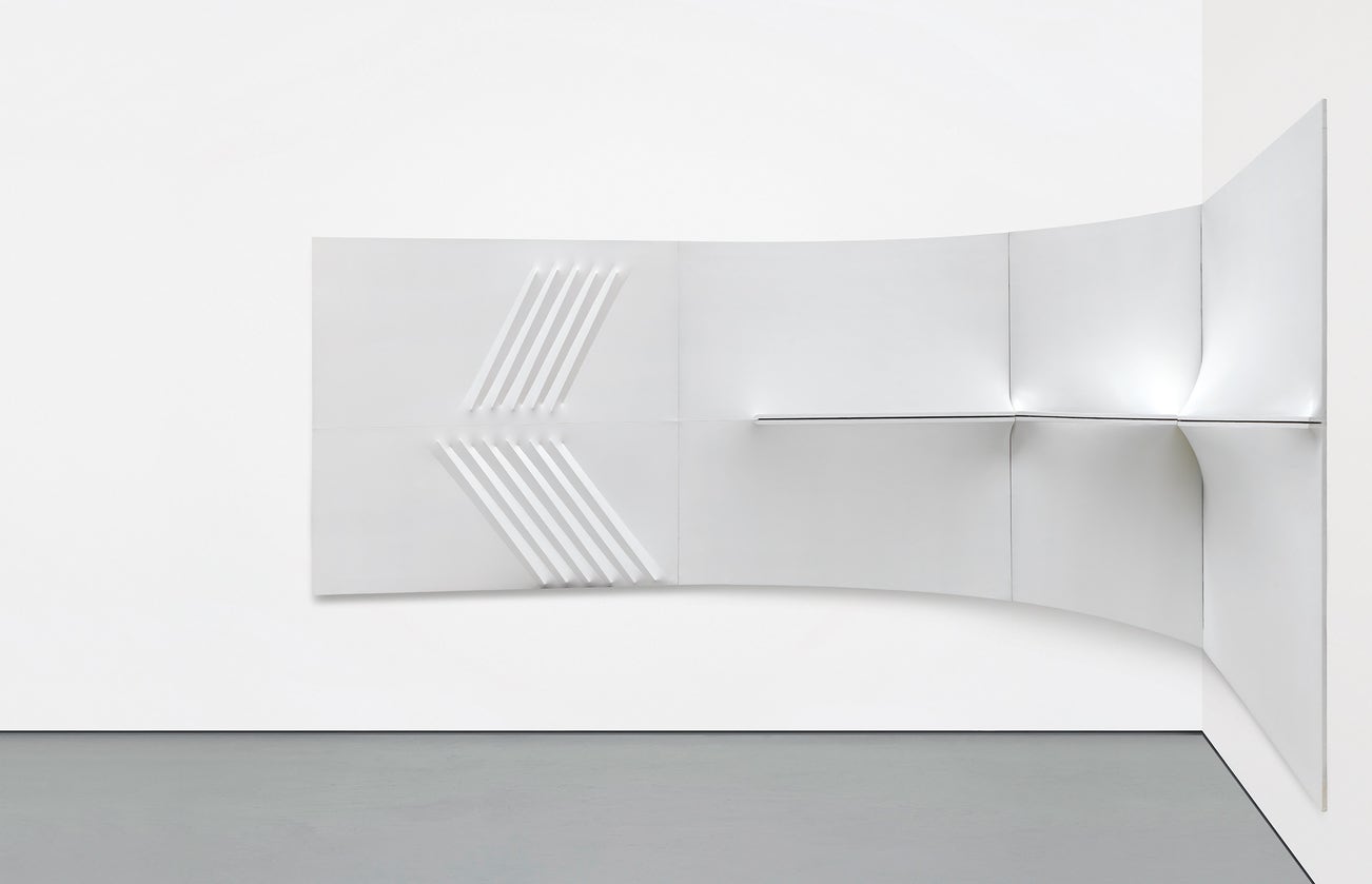 Stretching almost five-metres wide, Agostino Bonalumi’s Untitled, 1973, is composed of four identically sized white canvases which, in sequence, seem to unroll an abstract narrative. Inhabited by geometrically formed protrusions, the assembled paintings expand across two walls as though in motion. As a result, the installation is as conceptually innovative as it is spatially impressive, effectively aligning with the Italian artist’s fundamental motivation to materialise new ways of interacting with space. The work’s date of execution is also not inconsequential: it immediately precedes a retrospective of the artist’s at Palazzo dei Musei, Modena, in 1974, and is inscribed in a period of extensive spatial experimentation, amounting to the creation of some of Bonalumi’s most striking works.