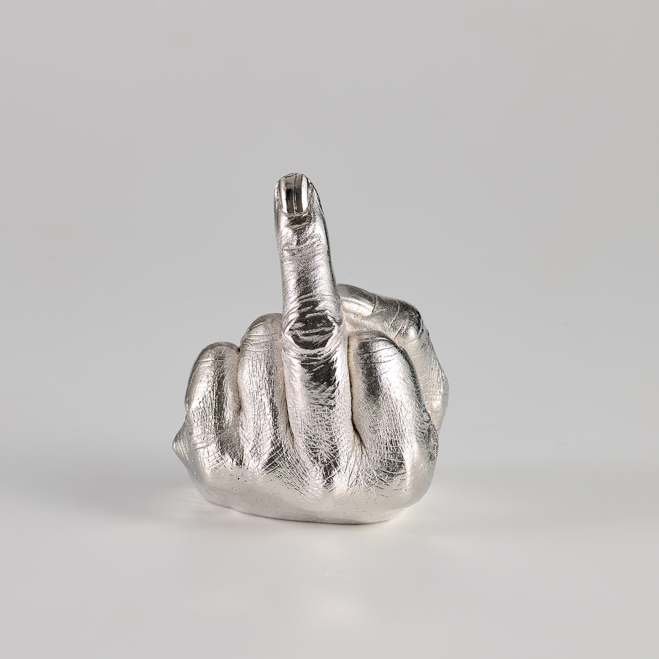 Cast urethane resin multiple with electroplated rhodium, contained in the original cardboard presentation box.