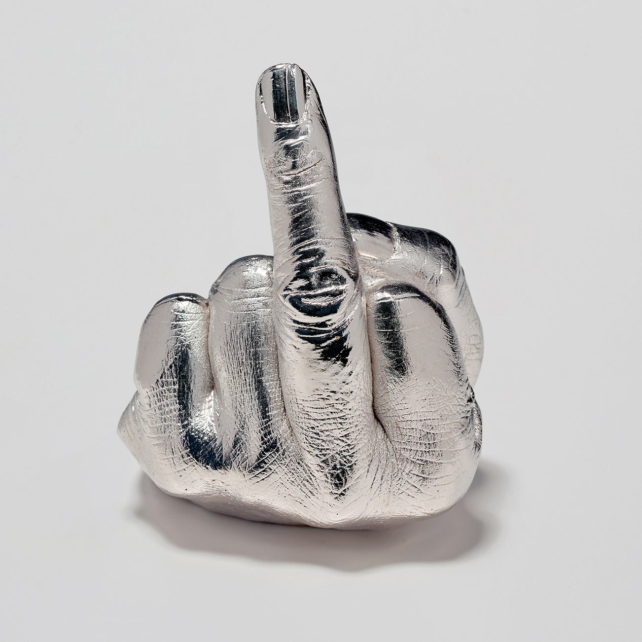 Cast urethane resin multiple with electroplated rhodium, contained in the original cardboard presentation box.