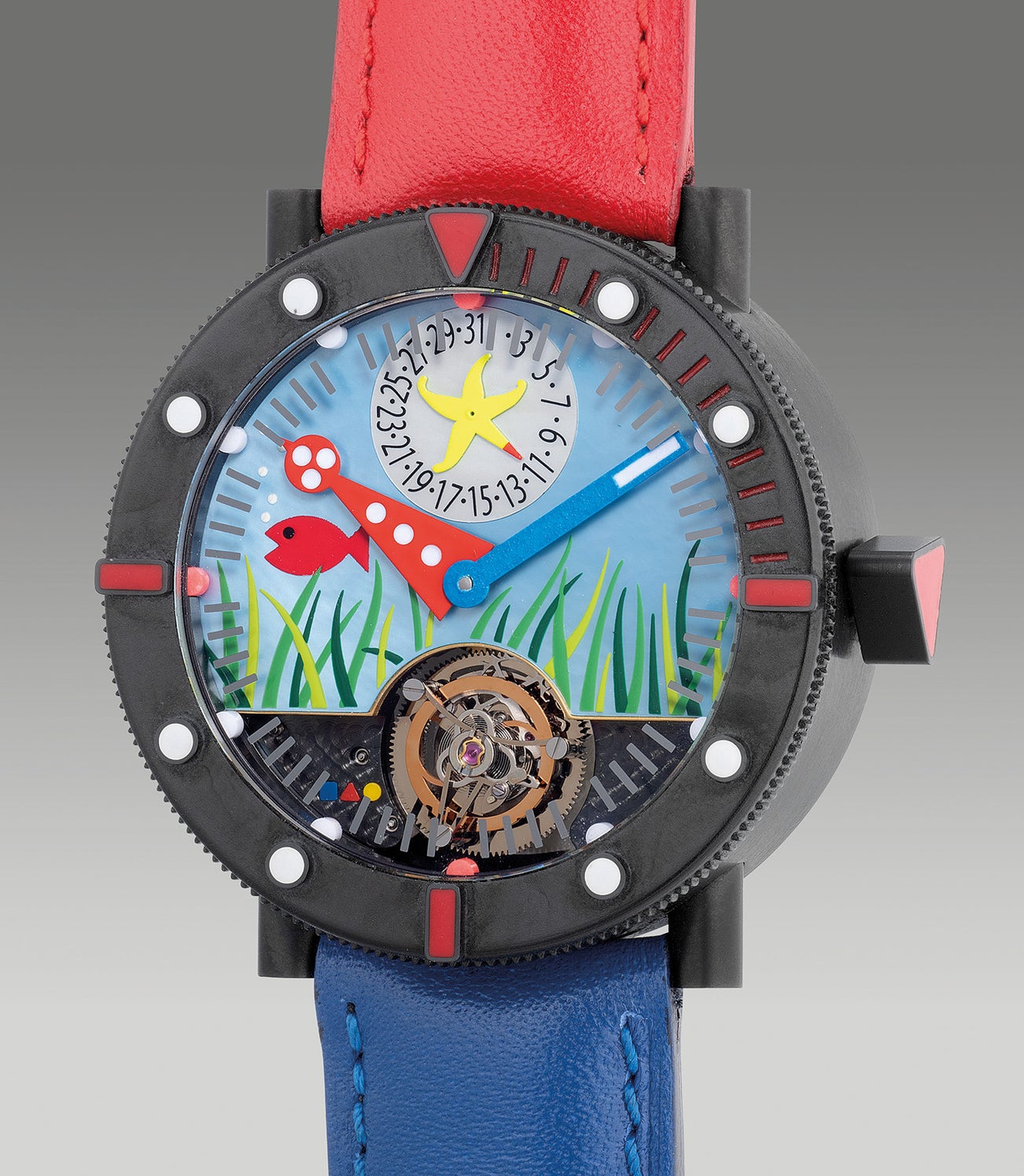 The Marine Black Sea truly exemplifies his vision in blending high horology with Bauhaus design. Immediately grabbing your attention with its dual-colored red and blue strap, a flying tourbillon takes the center stage inside a bold black PVD titanium porthole-shaped case. Executed in the utmost playful manner, the dial exhibits a colorful painted aquatic scene on a shimmering mother-of-pearl definitely brings out the child in you. The passage of time told by the whimsical hour and minute hands, while the red-tipped starfish starts your day certainly brings a smile to the wearer’s face. Powering this fun interpretation houses a manual-winding engine in a deeply recessed case, where horology excellence is displayed with the flying tourbillon that was designed and signed by Silberstein, and manufactured by Swiss craftsmen. Extraordinary with incomparable playful charm, the present timepiece is in almost unworn condition and offered with its full accessories, and is also numbered 1 out of a series of only 9 pieces.