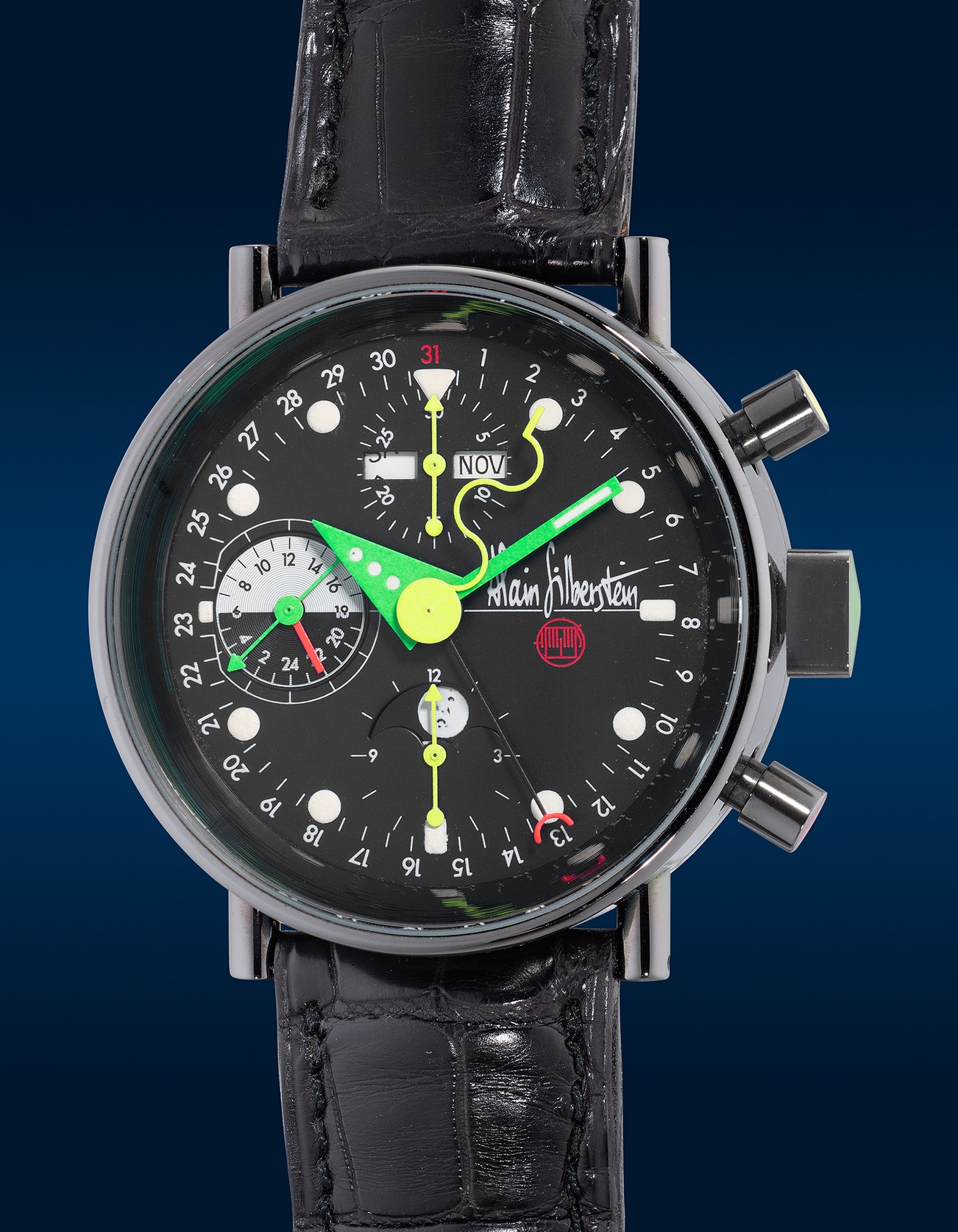 An innovative and attractive black PVD-coated stainless steel annual calendar chronograph wristwatch with 24-hour indication and moon phase