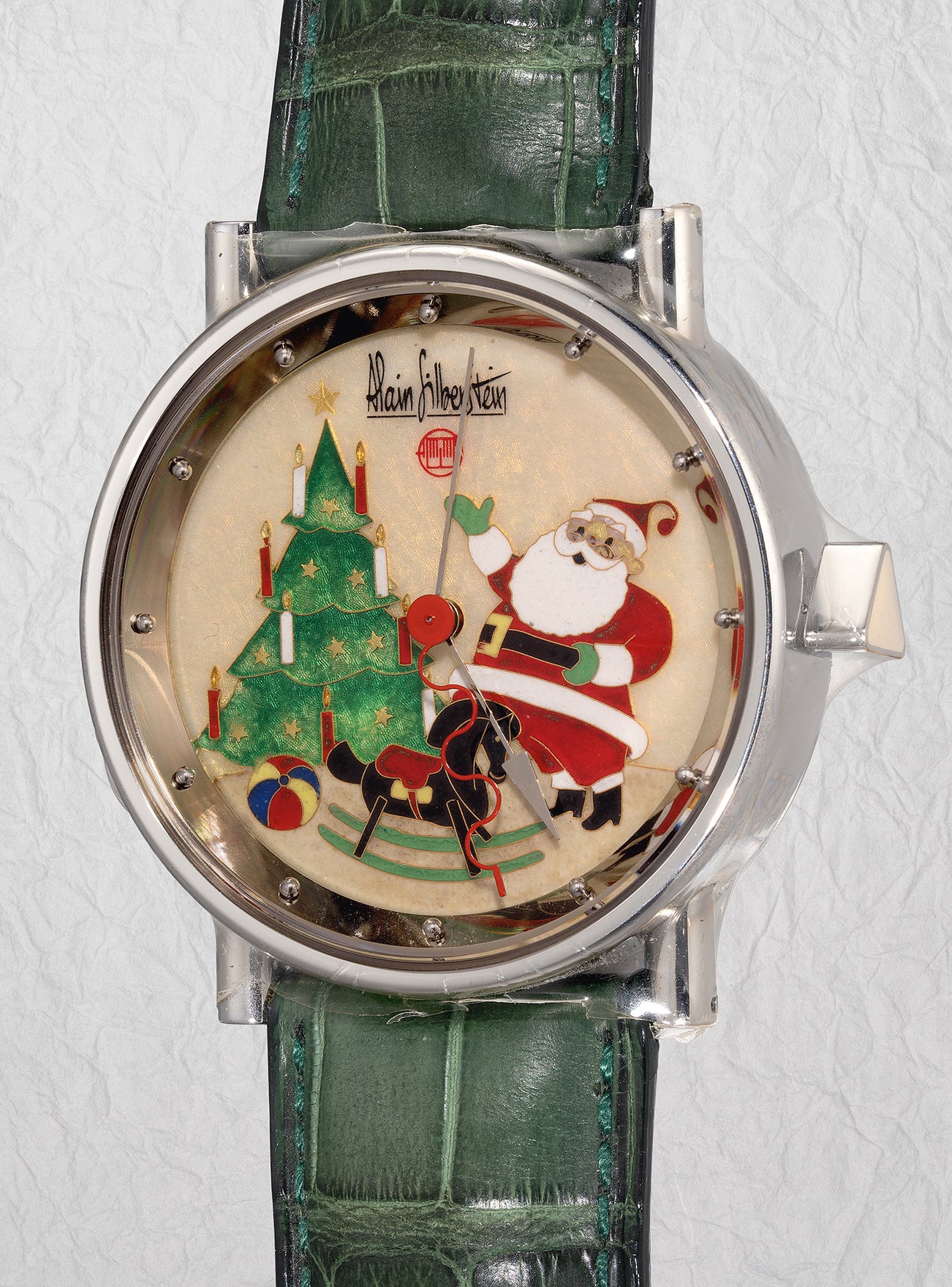 A unique “new-old-stock” stainless steel wristwatch with cloisonne enamel Santa Claus dial, bracelet, certificates and presentation box