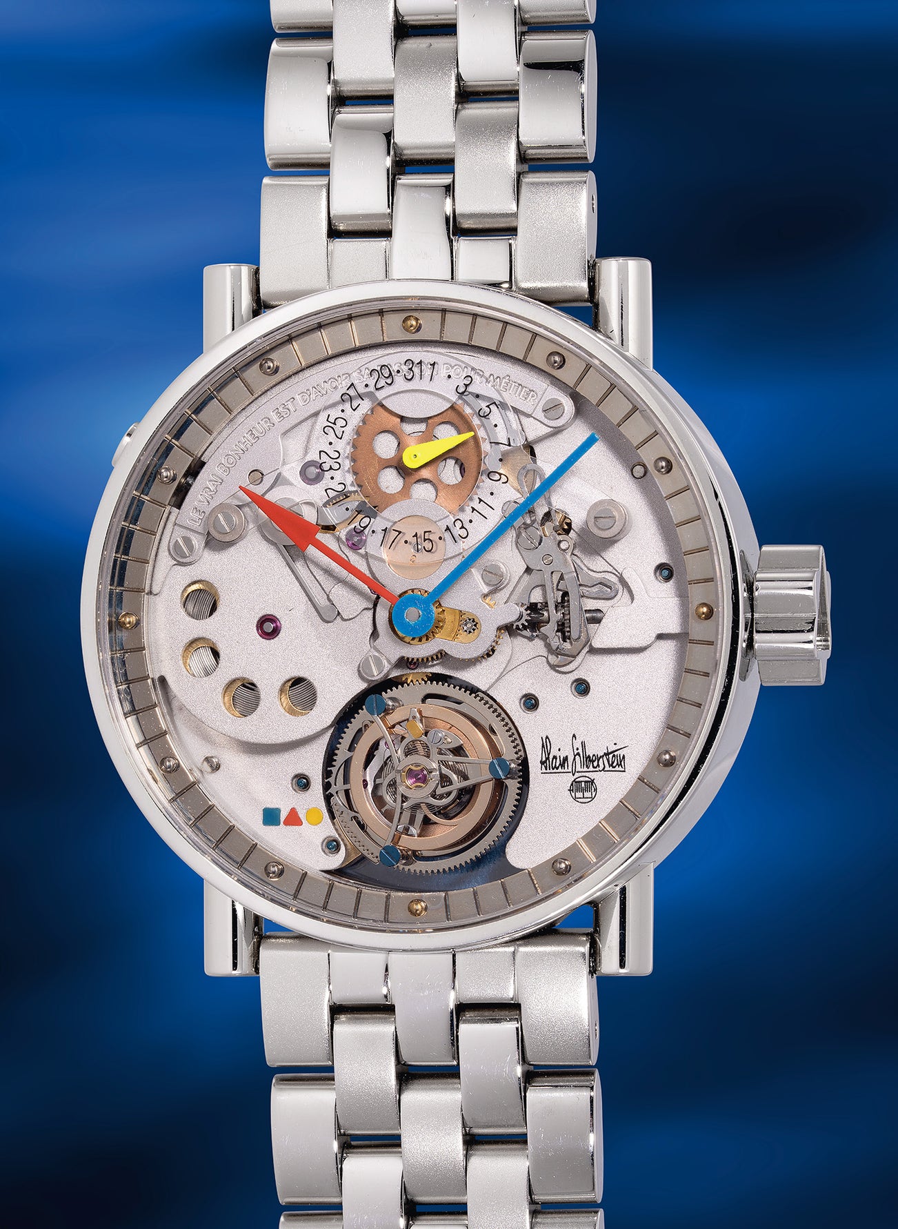 Instantly recognizable for his bold use of color and geometric forms, Alain Silberstein is a maestro of watch design. The Tourbillon Volant model, released in the early 2000s, exemplifies Silberstein's vision of merging high horology with Bauhaus aesthetics. Its cylindrical case, straight lugs, and playful dial layout immediately capture attention. Crafted in simple geometric shapes with primary colors, the dial and hands reflect Silberstein’s light-hearted and whimsical approach to watchmaking.