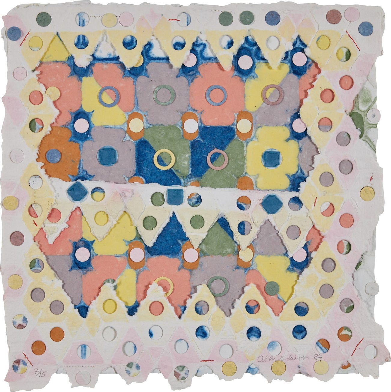 Punched, glued, sewn and assembled Handmade paper in colors, the full sheet.