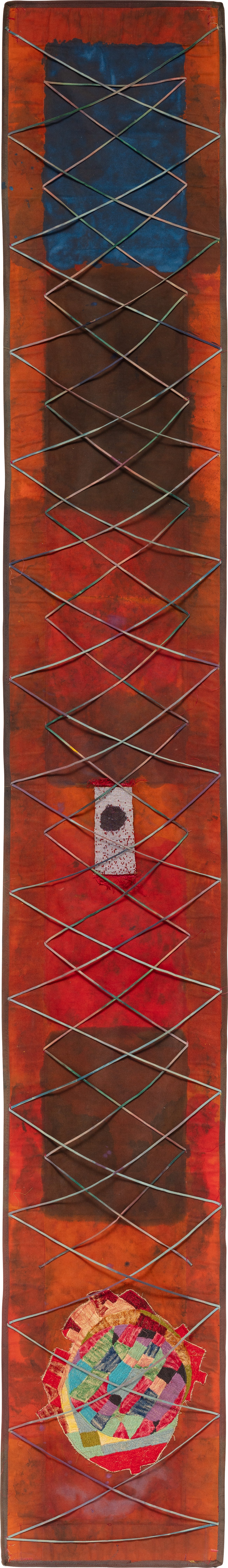 acrylic, pigment, rope, embroidery and glass beads on fabric