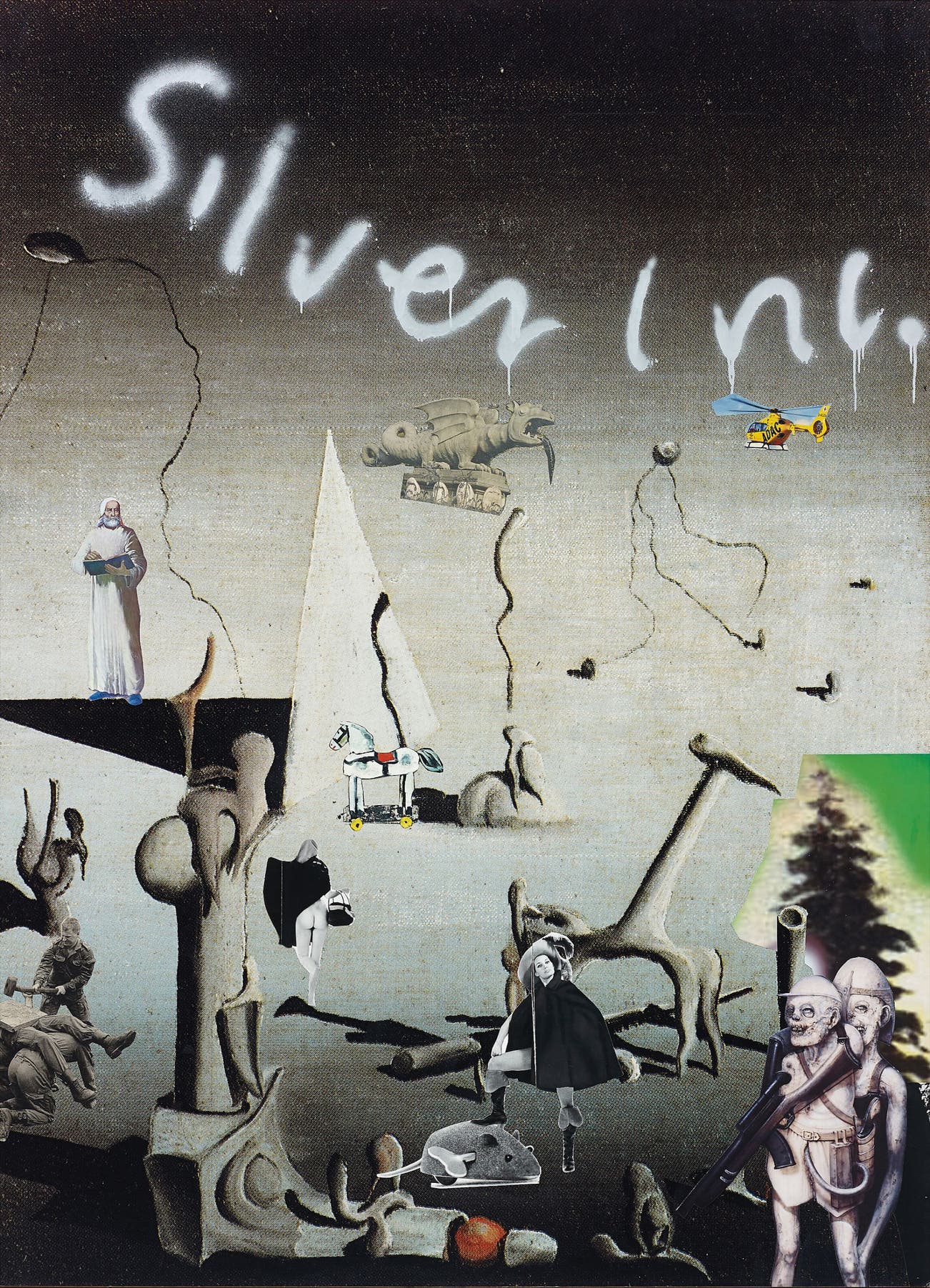 collage, spray paint, inkjet on paper laid on board