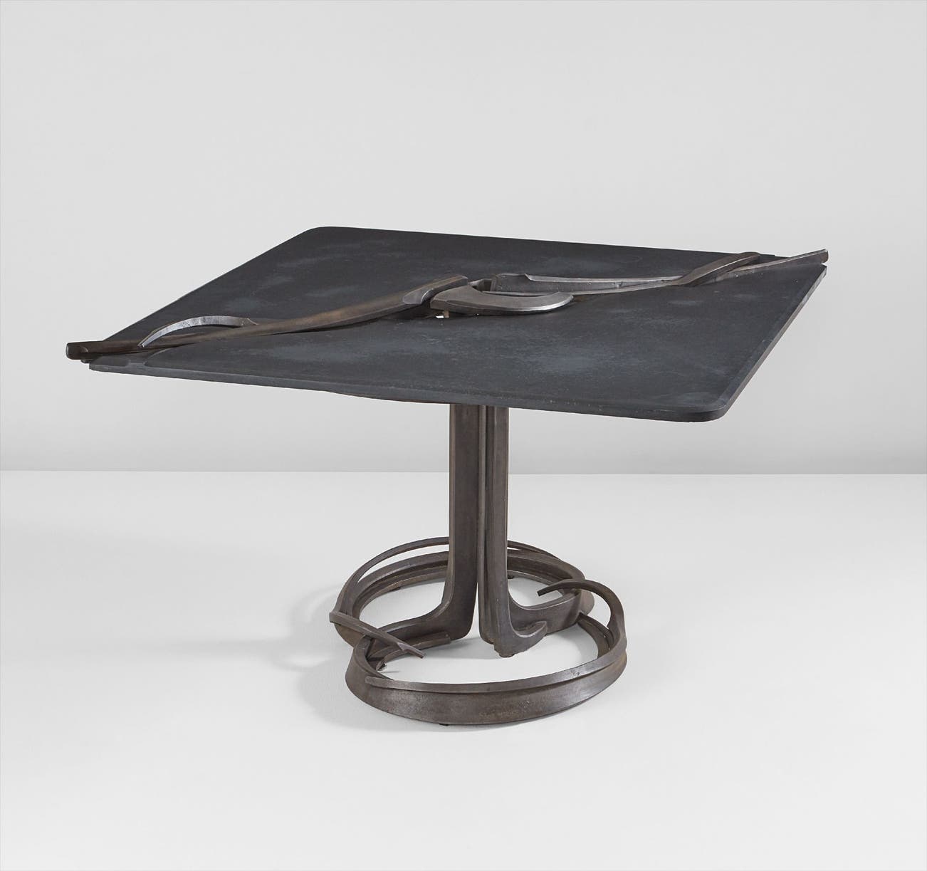 Slate, patinated steel.