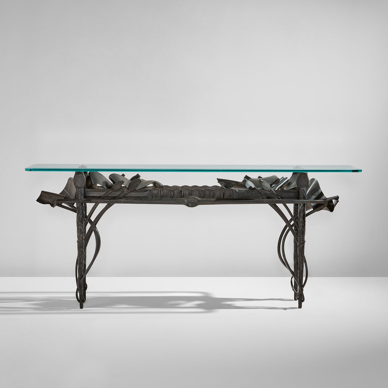 A celebrated master of contemporary American metalwork, Albert Paley is acclaimed for his dynamic contortions of the medium. Trained as a goldsmith, Paley began his career designing jewelry that emphasized its relation to the body, works that were later referred to as “wearable sculptures.” Shortly after his faculty appointment to the School for American Craftsmen at Rochester Institute of Technology in 1969, Paley opened his metalworking studio and began to explore the boundaries of production in iron. In 1974 the Renwick Gallery of the Smithsonian American Art Museum commissioned Paley for iron gates, propelling him into the realm of architectural recognition. Designing both decorative arts and monumental public commissions, Paley draws on the visual language of the Gothic, Baroque and Art Nouveau periods, though he has pronounced the process of forging itself as his most salient influence. The present console table indeed conjures the floral motifs of Art Nouveau; however, its persistently undulating lines, which create a sense of perpetual animation, proclaim its singularity. Major American institutions carry works from Paley’s œuvre, including the Smithsonian American Art Museum, Washington, D.C; The Metropolitan Museum of Art, New York; the Museum of Art and Design, New York; and the Philadelphia Museum of Art.