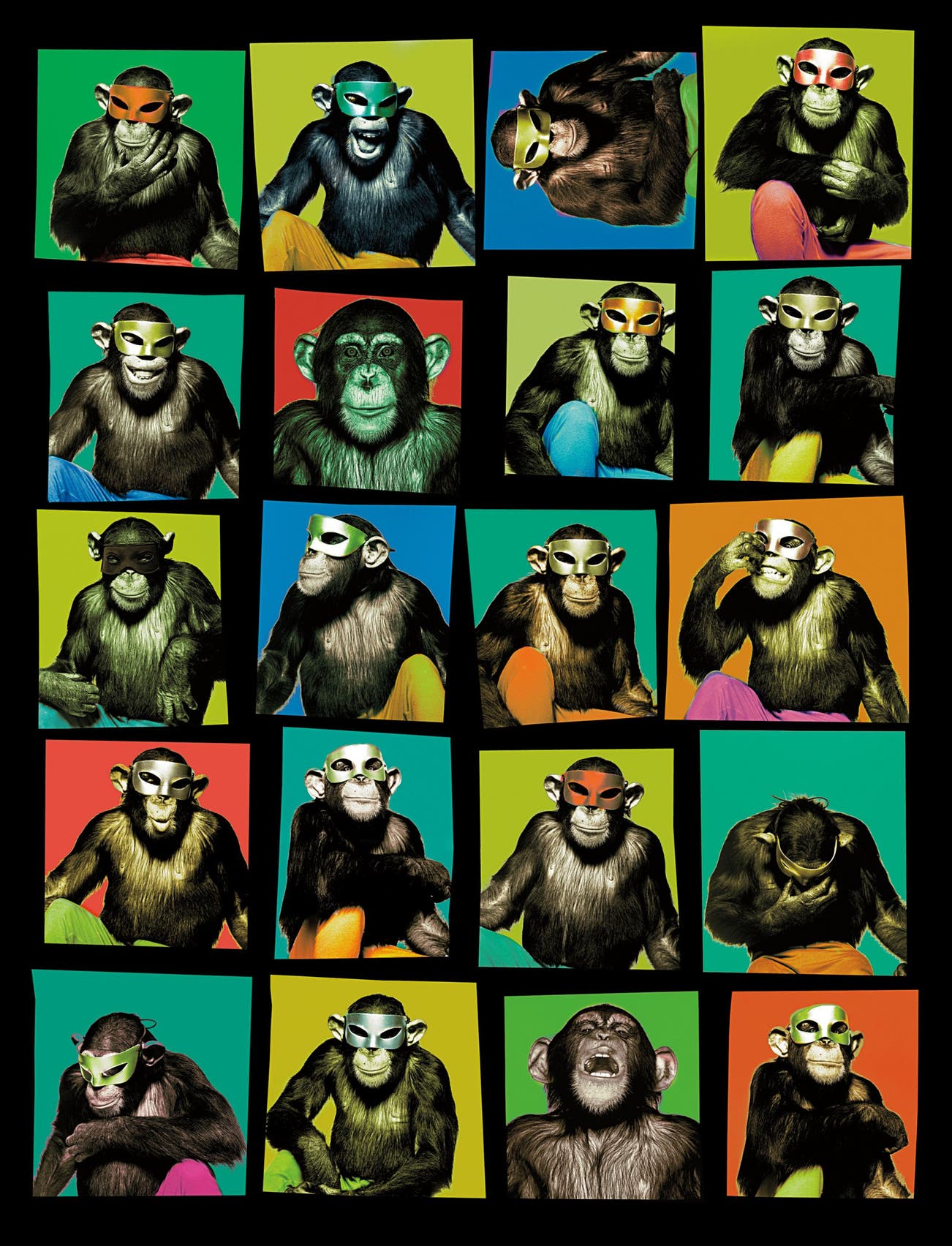 James Crump, the author of Watson’s 2007 monograph, best explains this image: “Watson enjoyed photographing the monkeys because it was a personal project inspired by the unpredictability of these creatures. In very typical Watson fashion, he approached the subject matter graphically. The assemblage is created from a cut-up selection of individual portraits that revolve around moods and characters not dissimilar from those the photographer often extracts from his human sitters. The humorous composition is as complex as any he’s ever made."