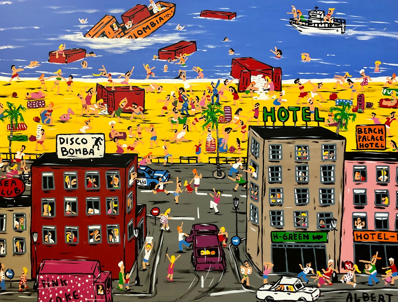 signed 'ALBERT' lower right; signed, titled and dated 'ALBERT WILLEM, 2021, Albert Willem "AN UNEXPECTED PARTY ON THE BEACH"' on the reverse
