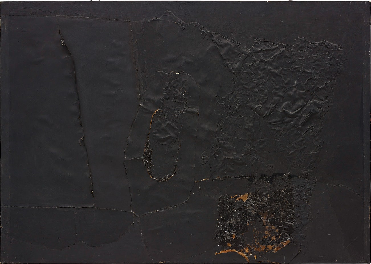 Plunged in a mass of textural darkness, Combustione E 4, 1960 represents the apotheosis of Alberto Burri’s iconoclastic gesture. Lauded for his early work exploring processes of assemblage and construction, the artist later ventured towards new creative realms vested with ingenious methods of obliteration. The most striking materialisation of this artistic evolution took form in the artist’s Combustioni series, commenced in 1955 and revolving around the use of fire. A commanding example from this cycle of works, Combustione E 4, reveals the creative potential of destruction, and, like an abject landscape, conjures an irrepressible sense of urgency.