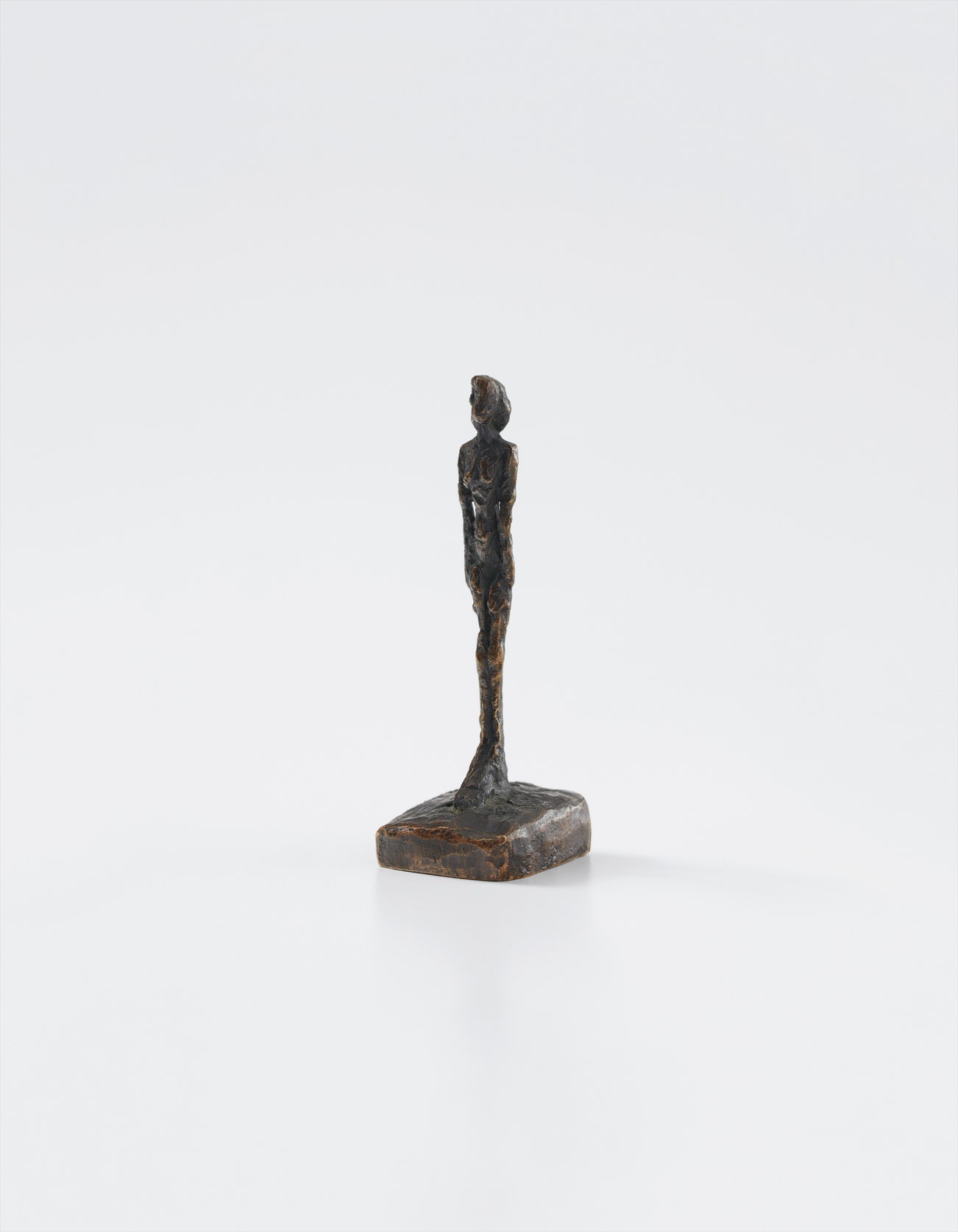An elegant example of one of the most iconic images in the artist’s oeuvre, the standing female nude, Alberto Giacometti’s Figurine exudes a striking presence remarkable for its delightful size. At the end of the 1930s, Giacometti began sculpting figures at a reduced scale, at once suggesting the appearance of viewing a person from a distance as well as reflecting the image becoming more and more distant in the artist’s mind when working from memory. Having left occupied Paris for Geneva during the Second World War, Giacometti famously returned to his Paris studio in mid-September 1945 with all of his work from the previous four years contained in six matchboxes. These miniature sculptures became a symbol of resilience and the hardships of postwar Europe, and a number of them were published in the journal Cahiers d'art in 1946. While not quite in the elusive, minuscule size of his wartime sculptures, the present work reflects Giacometti’s tendency to work in a reductive scale, condensing distinctive features into intimate details that allude to a sense of experiencing the figure from far-off.