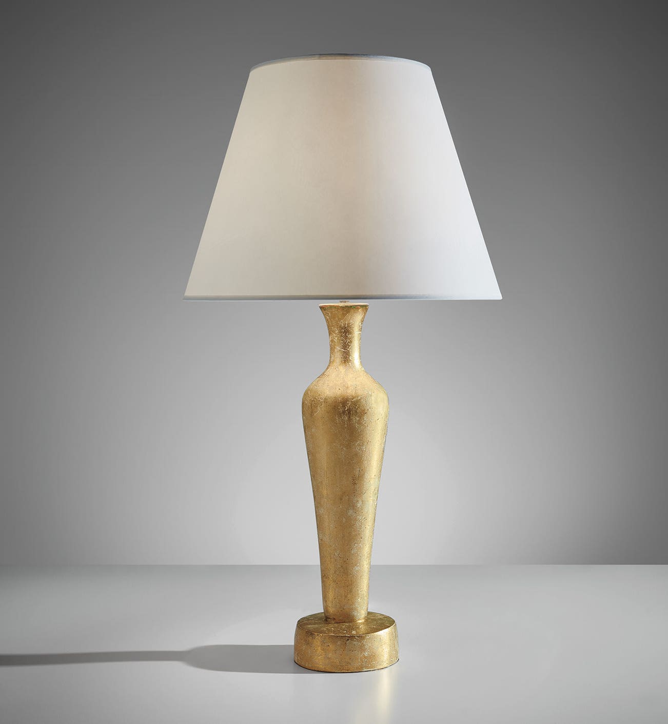 Designed by Giacometti possibly as early as 1934, the model was given the name Grecque (“Greek”). Its silhouette reflects an abstraction of both ancient Greek vessel forms and Cycladic artifacts. It could be ordered in two sizes and in a variety of materials and finishes (plain or patinated plaster, terra-cotta, and bronze). This is the larger version, made in gold-patina plaster.