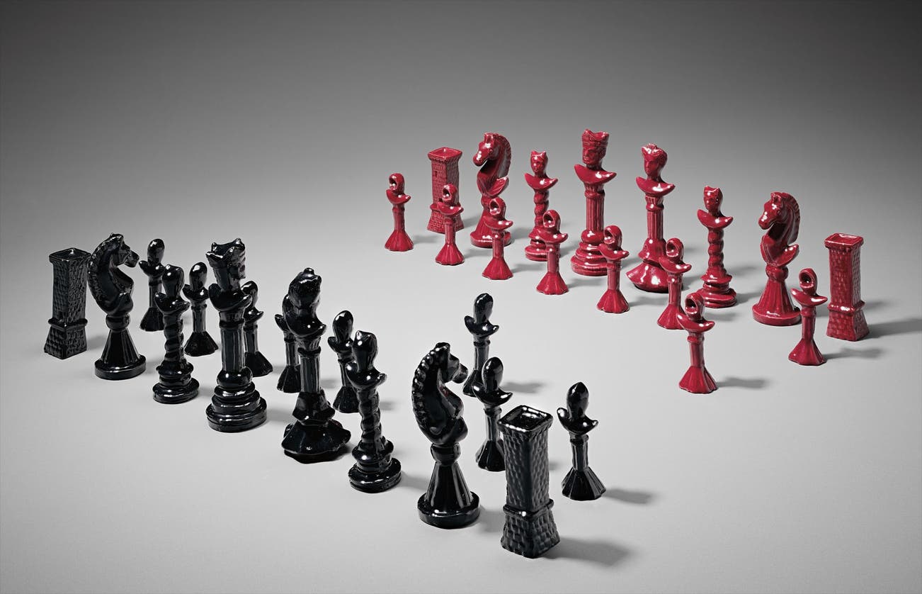 The present chess set is an exceptionally rare œuvre by Alberto Giacometti and is known to have been made for the decorator Jacques Adnet. The chess set made with the artist’s interpretive quality, presents thirty-two chess pieces, sixteen of which are dark red instead of the traditional white. The individual pieces are not functional for the purpose of the game, and instead become sculptures in their own right. Annette, Alberto’s model, muse and future wife met Giacometti in Geneva during the Second World War. In 1946, around the time this work was conceived, Annette joined him in Paris. Annette lies at the heart of Giacometti’s female figure in his most celebrated sculptures and portraits. In the present lot, the bust of the queen in the chess set is reminiscent of some of Giacometti’s most notable female compositions.