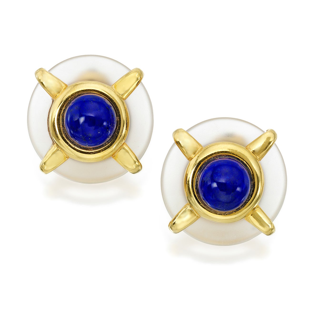 A Pair of Lapis Lazuli, Rock Crystal, and Gold Earclips