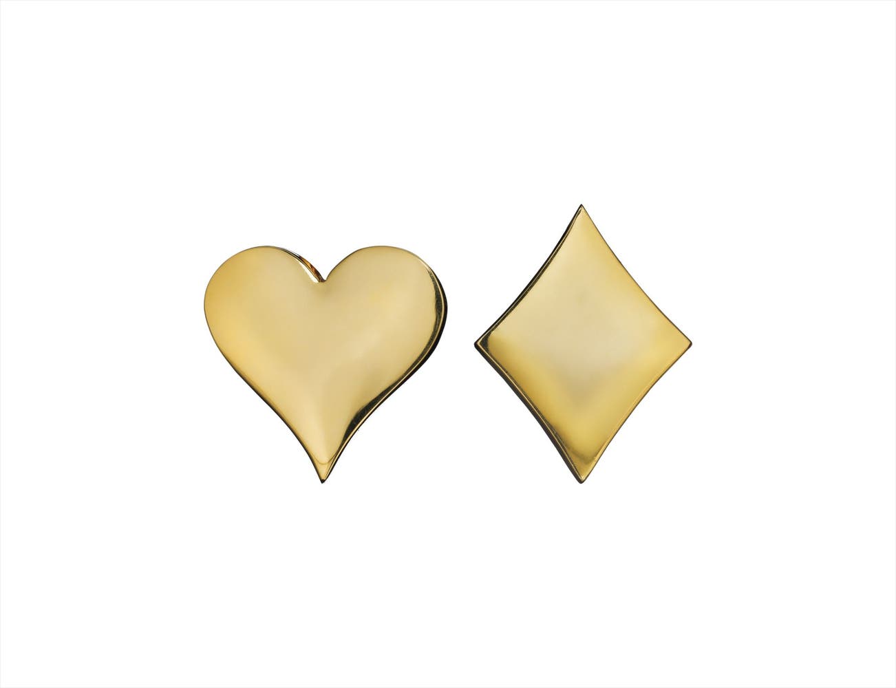 Designed as a polished gold heart and diamond-shaped plaque, mounted in 18K yellow gold, length 1 inch.