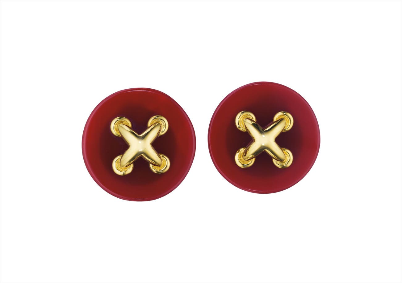 Each designed as a stylized button, centering upon a polished gold accent, to the carved carnelian plaque, mounted in 18K yellow gold, length 1 1/8 inches.
