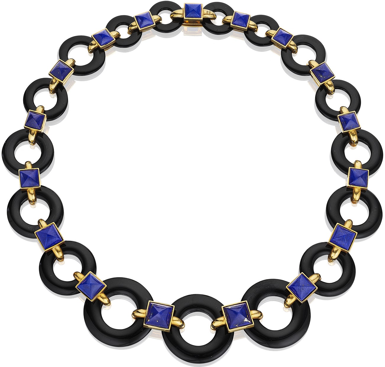 Set with alternating black circular onyx rings and pyramidal lapis lazuli, mounted in 18K yellow gold, length approximately 21 1/2 inches, signed Cartier, A. Cipullo.