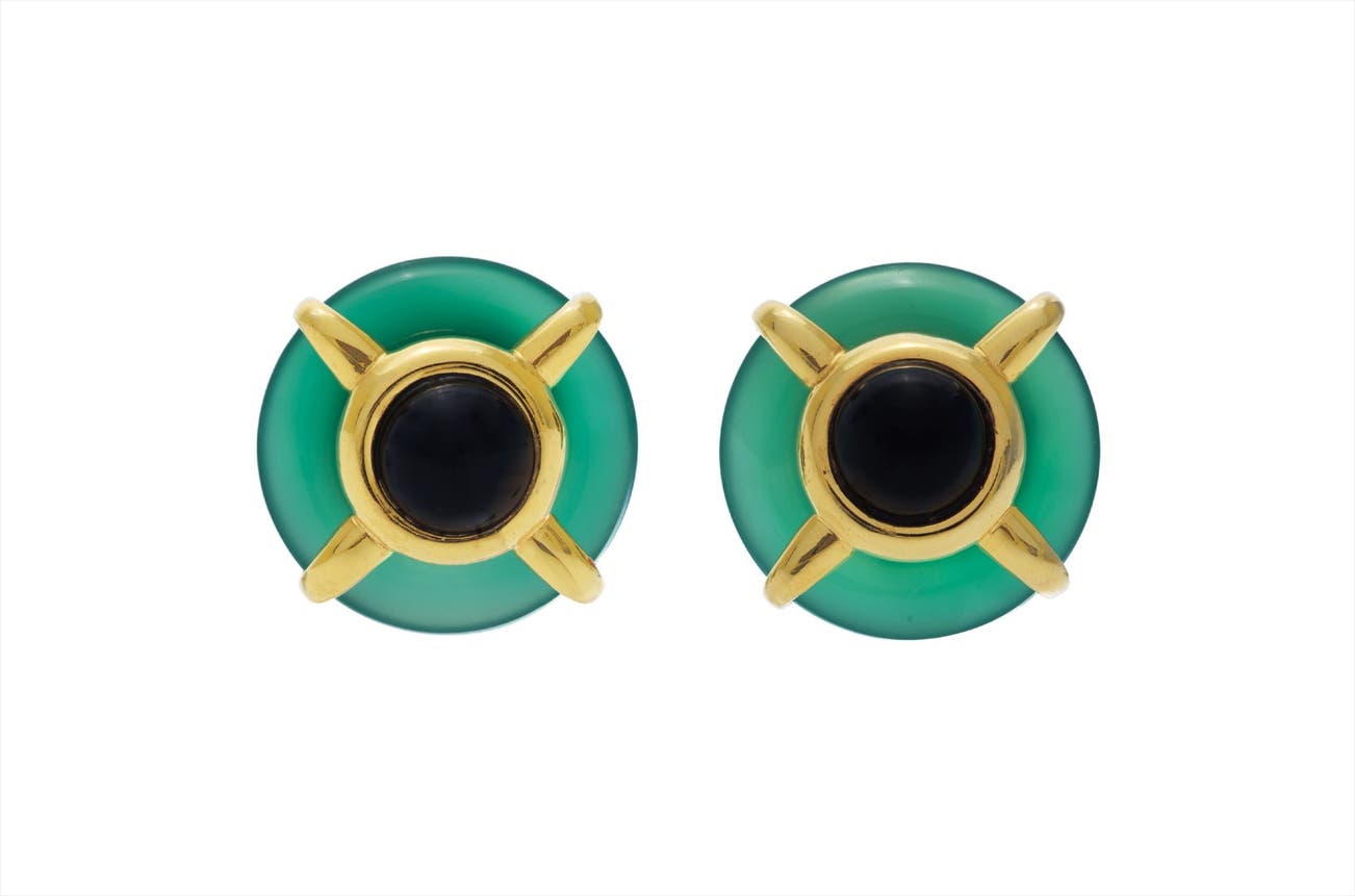 Each designed as a circular chrysoprase plaque enhanced by polished gold bands, centering upon a collet-set cabochon onyx, mounted in 18K yellow gold, length 1 1/4 inches.