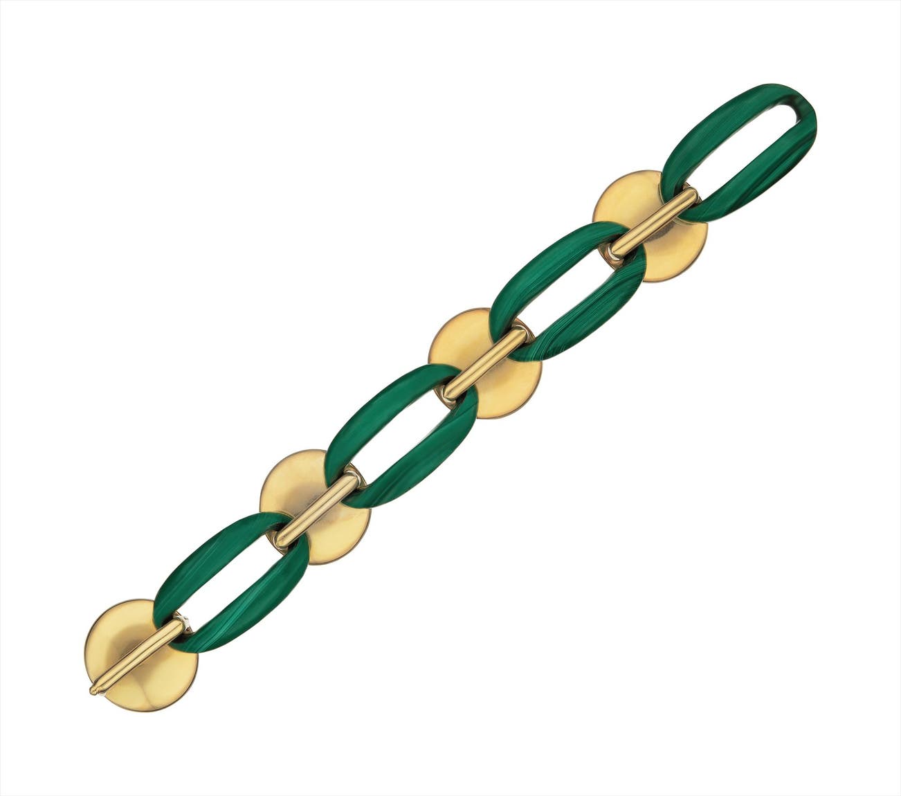Designed as a line of malachite links joined by circular polished gold plaques, mounted in 18K yellow gold, length 9 inches.
