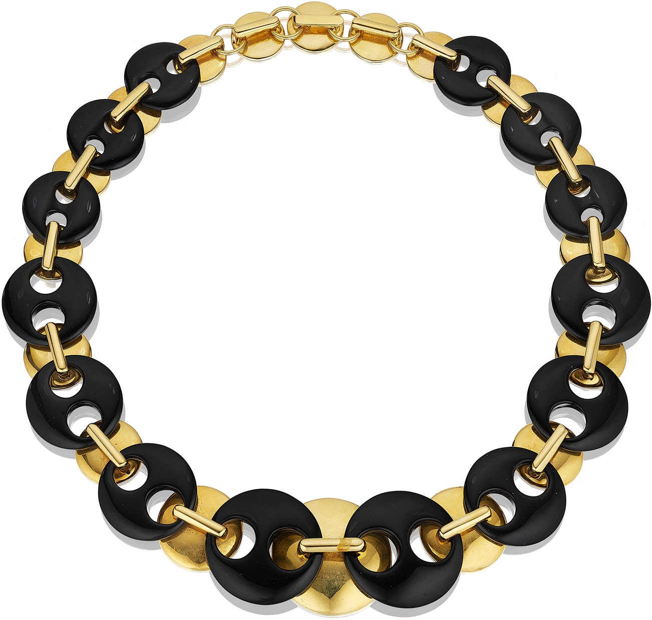 Set with circular onyx discs, alternating with gold disc links, mounted in 18K yellow gold, length approximately 21 1/4 inches, signed Aldo Cipullo.