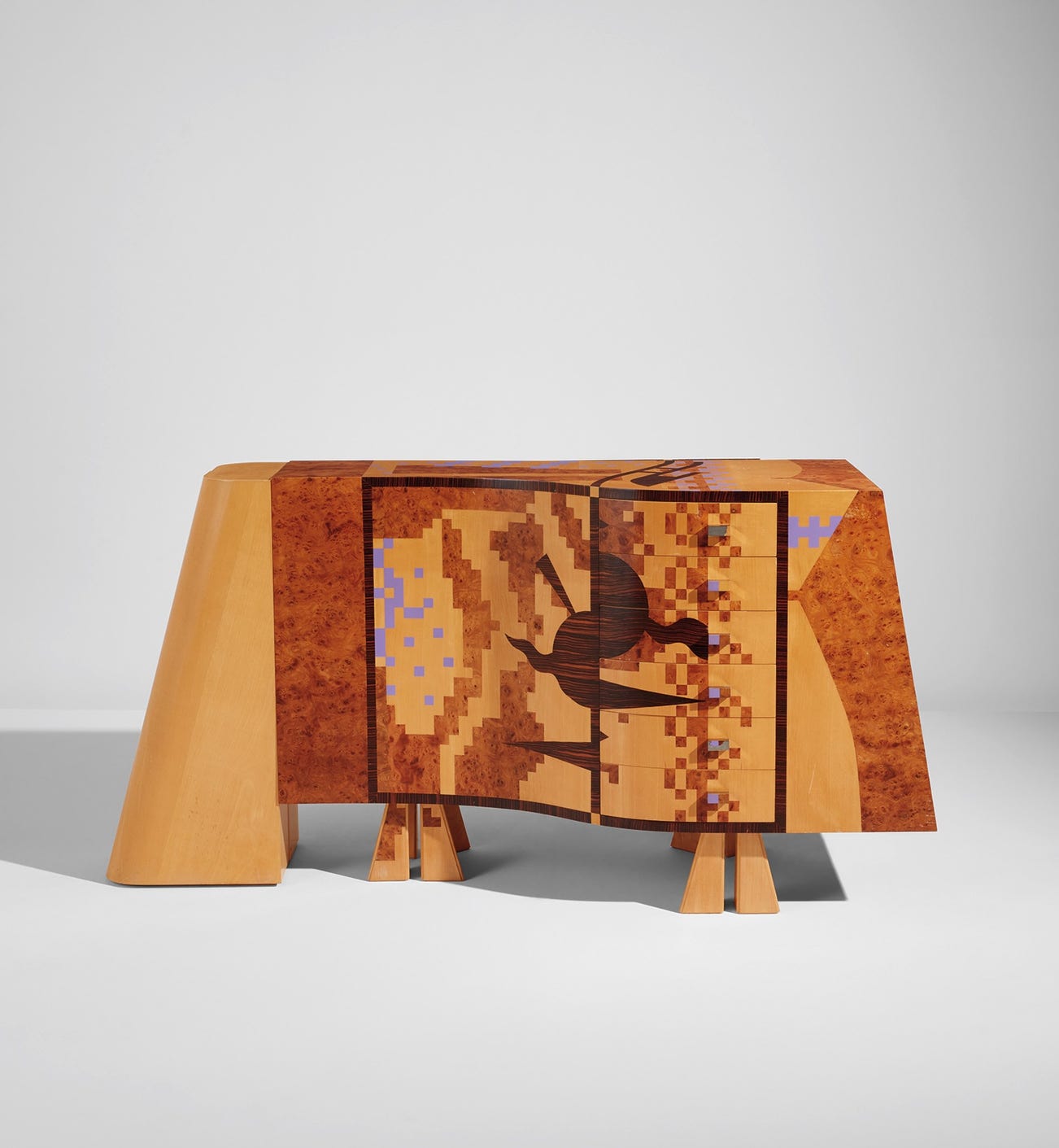 Though the present cabinet is a unique piece rather than an object of mass production, it still addresses this “paradox.” The pixelated motif made in inlaid woods on the top and sides appears throughout Mendini’s work, including the rug in his display. These patterns come from what the designer called his “Mendinigraph.” As an ironic gesture, it was meant to be used as a stencil that designers could use and re-use to construct avant-garde forms, further poking fun at what Mendini perceived to be an emptiness in the avant-garde of the mid-1980s. Despite this pessimism, this one-of-a-kind piece of furniture is truly a pinnacle expression of Italian design from the second half of the twentieth century.