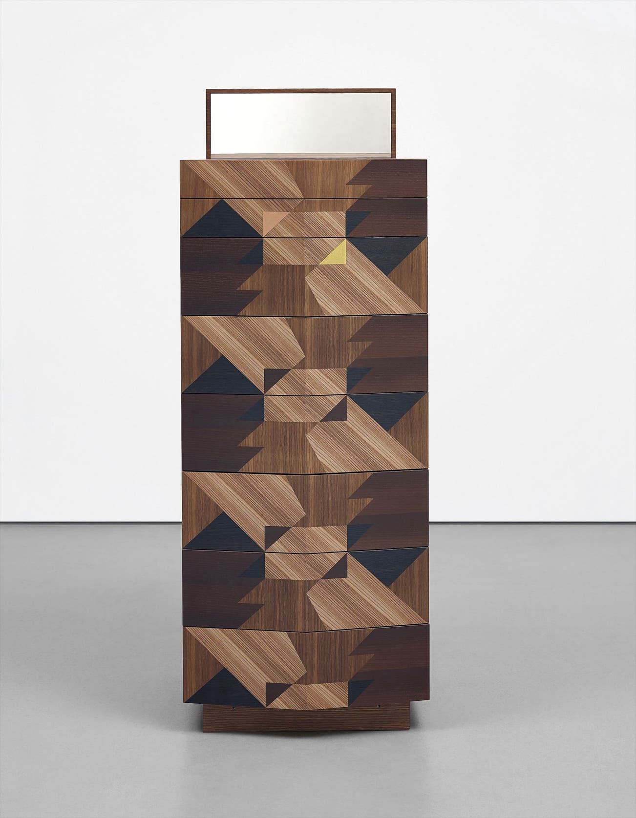 Elm-veneered wood, oak-veneered wood, acacia-veneered wood, brass, bronze, stainless steel, mirrored glass.