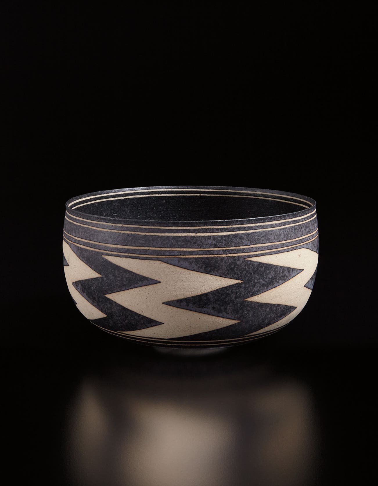 Stoneware, manganese glaze and masked resist design.