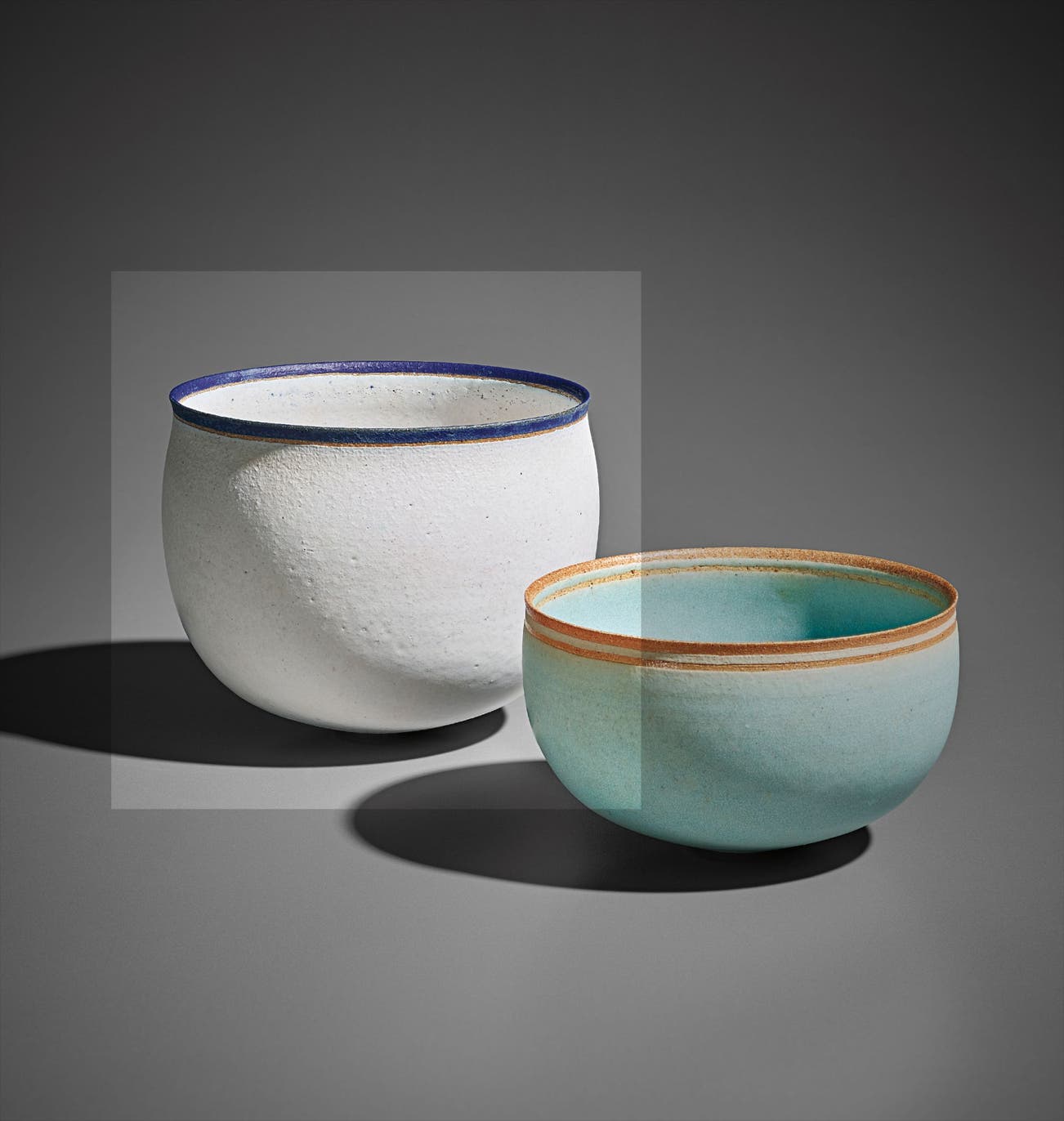 Stoneware, matt white glaze with occasional blue speckles, an unglazed band and a cobalt glaze lip.