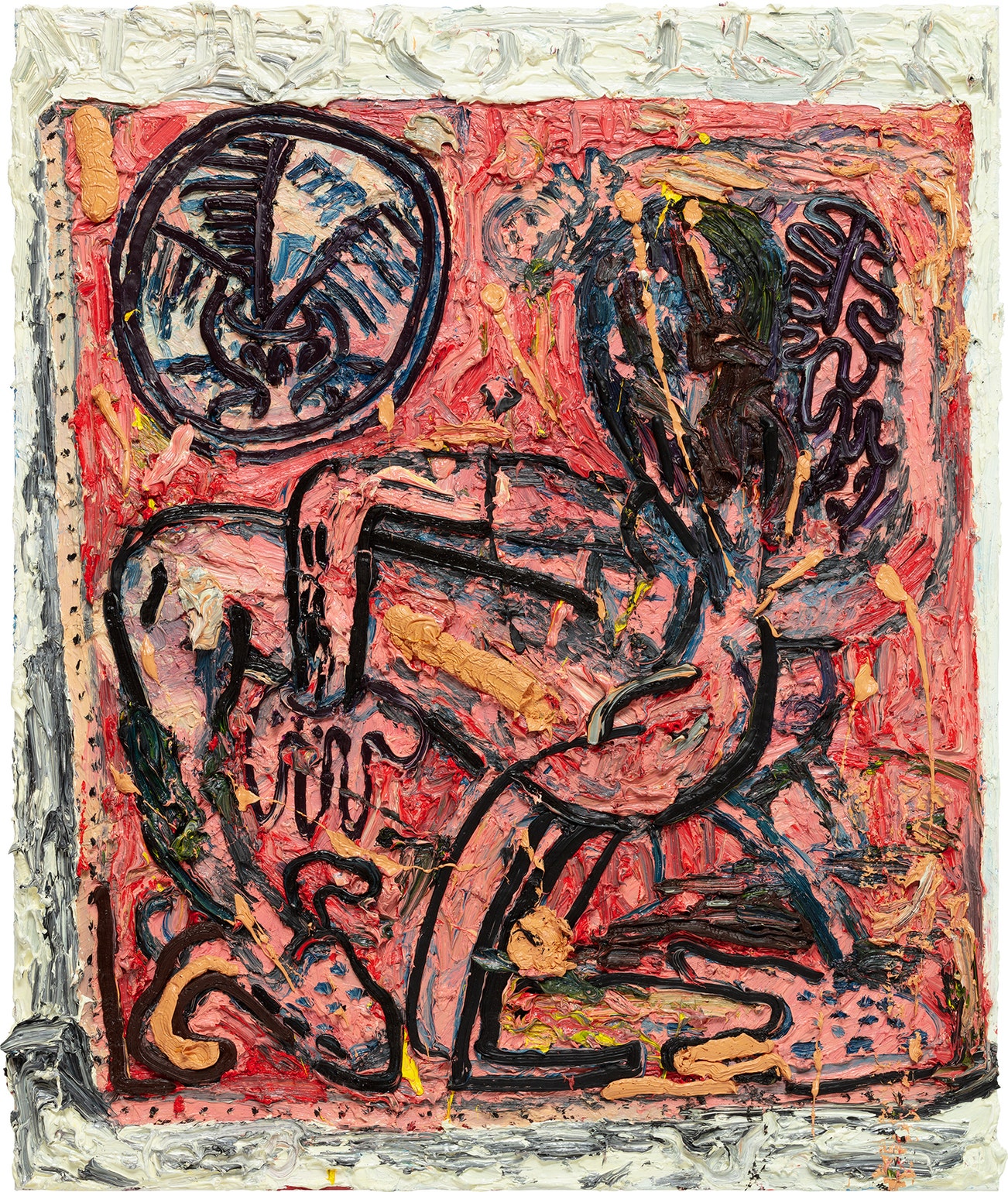 signed, titled and dated "Sep. 2015 ALEX BECERRA Painting of a Painting Pink Figure w/ Crocs" on the reverse