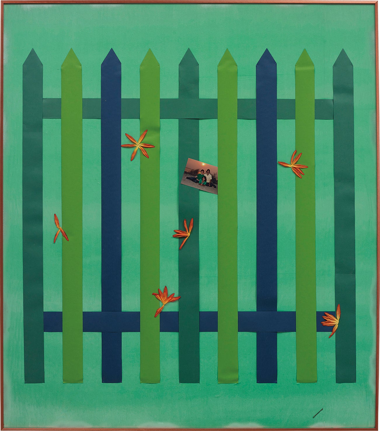 paper, sequin pins, silk flowers, bobby pin and photograph on velvet, in artist's frame