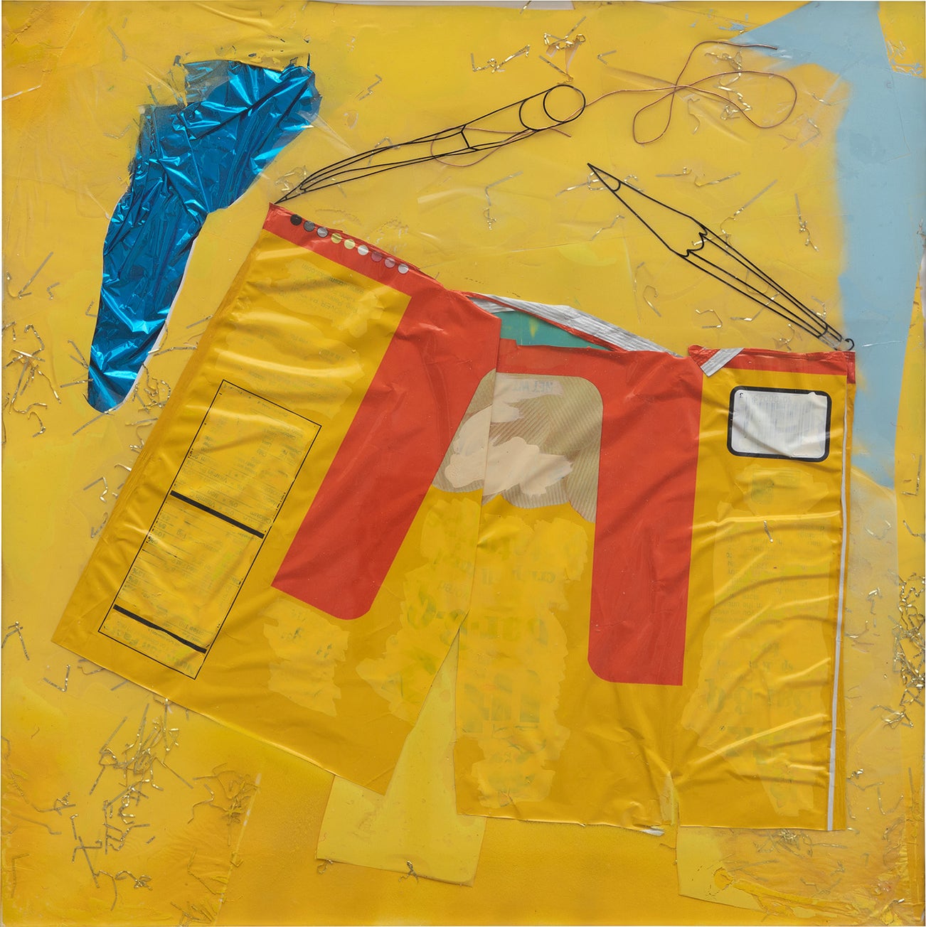 IKEA metal frame, UTZ Salt and pepper potato chips, foil, enamel, spray paint, adhesive, vinyl, fabric and glue