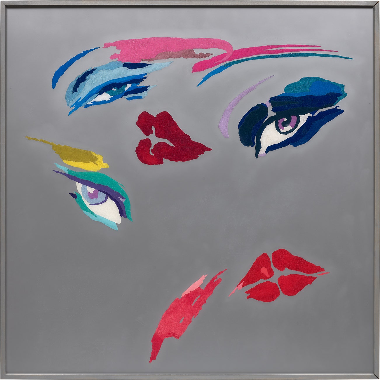 spray paint, glitter, digitally printed poplin, foam, velvet and Plexiglas, in wood artist's frame