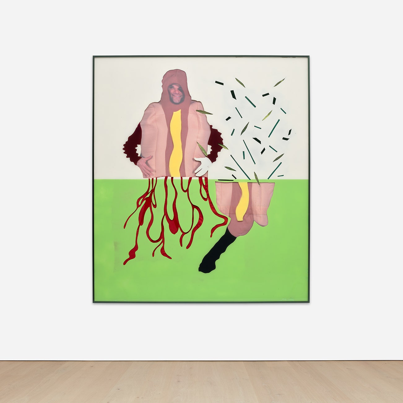 digitally printed sheer nylon, plastic leaves, velvet, ribbon, theatrical stage gels, suede, sequin pins, foam, tape and spray paint on Plexiglas, in artist's frame